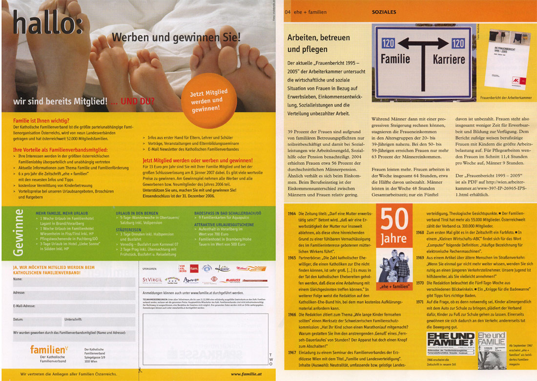 Von 2004 bis 2006 unterstützten wir den Katholischen Familienverband Österreichs bei der Erstellung seiner Zeitung „ehe + familien“. Das Medium erscheint sechsmal pro Jahr.