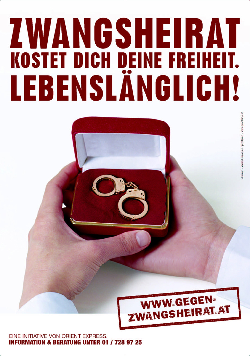 Ziel des Projekts ist die Aufklärung über Zwangsheirat. Ein Beitrag in der ORF-Sendung „Thema“ weckte das allgemeine Interesse. Infolge interessierten sich auch öffentliche Stellen für den Kampf gegen Zwangsheirat. Auf Basis des Slogans „Zwangsheirat kostet dich deine Freiheit. Lebenslänglich!“ wurden unterschiedliche Kommunikationsmittel gestaltet. Die Website www.gegen-zwangsheirat.at bietet Informationen zum Thema. Aufkleber und Folder rundeten die Kampagne ab. Das von Werner Gregori entworfene Plakat kürten die Leser der Zeitung „medianet“ zum „Best Sujet 2005“.