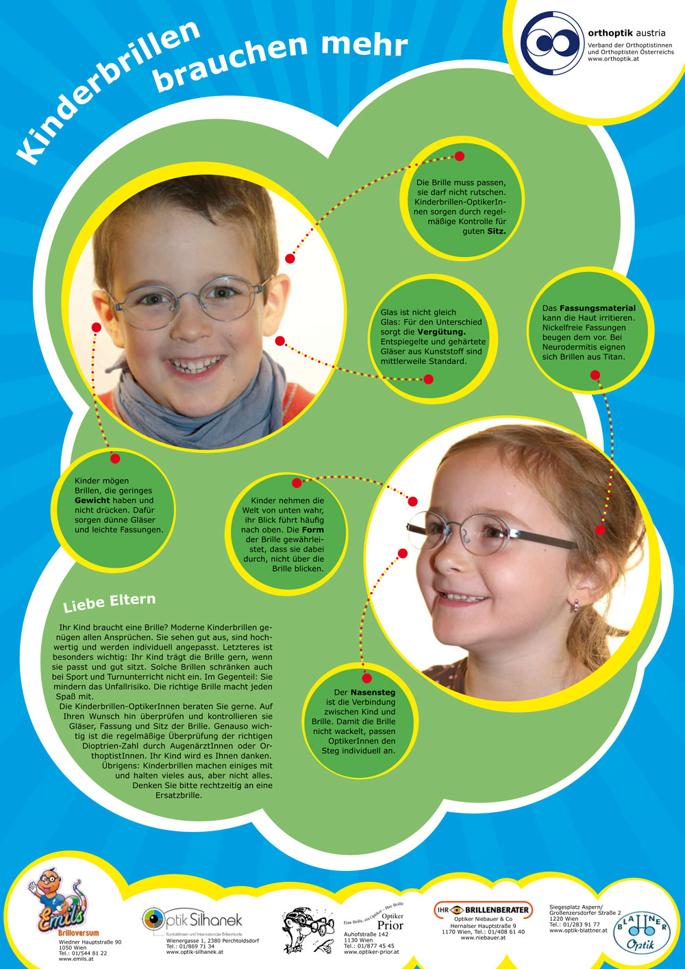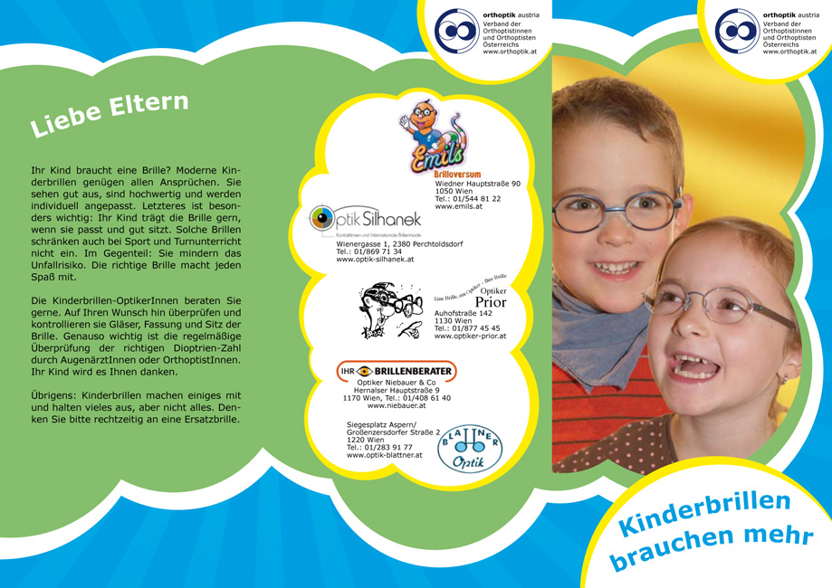 Unter dem Motto „Kinderbrillen brauchen mehr“ entwickelten wir für den Verband der Orthoptistinnen und Orthoptisten Österreichs Infomaterial. Plakate und Folder helfen Eltern bei der Auswahl der richtigen Brille für ihr Kind.