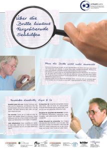 Aber nicht nur Kinder brauchen Sehbehelfe. Darum produzierten wir auch Informationsmaterial für vergrößernde Sehhilfen. Titel der Kampagne: „Über die Brille hinaus: Vergrößernde Sehhilfen“. Anders als bei Kinderbrillen handelt es sich dabei um ein ungleich komplexeres Thema, das wir gänzlich anders aufbereiteten.